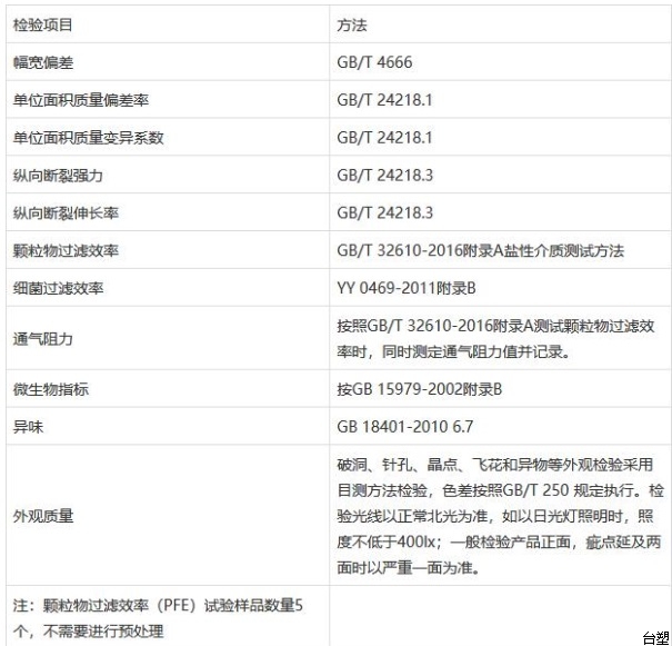 出廠檢驗項目為:幅寬偏差、單位面積質量偏差率、單位面積質量變異系數;顆粒物過濾效率、通氣阻力、異味。